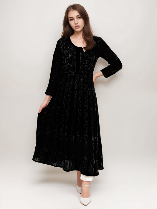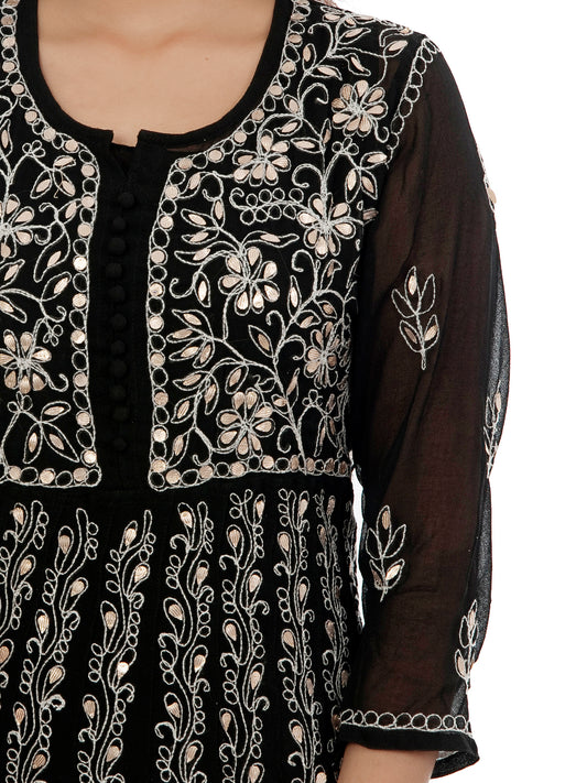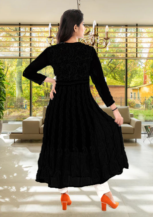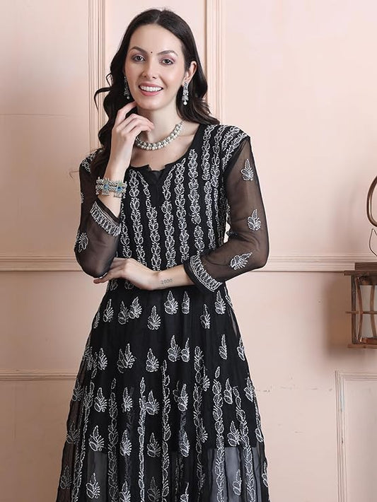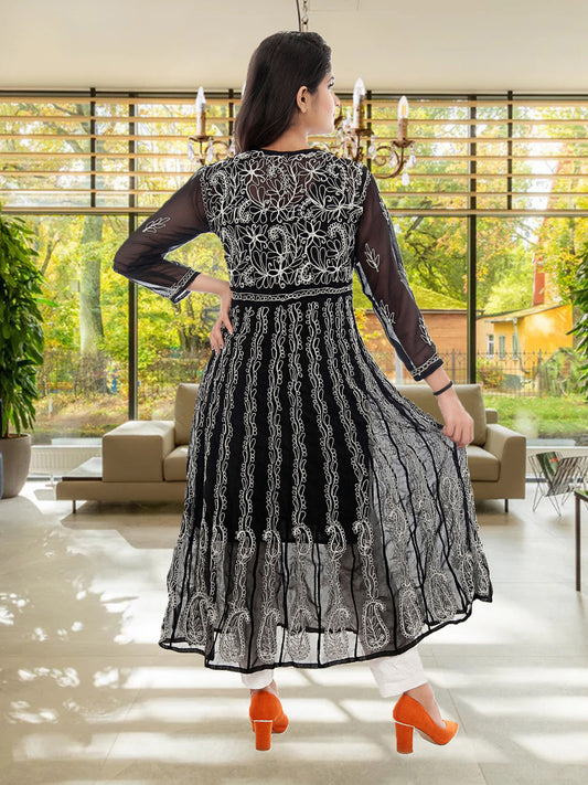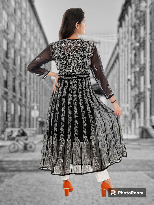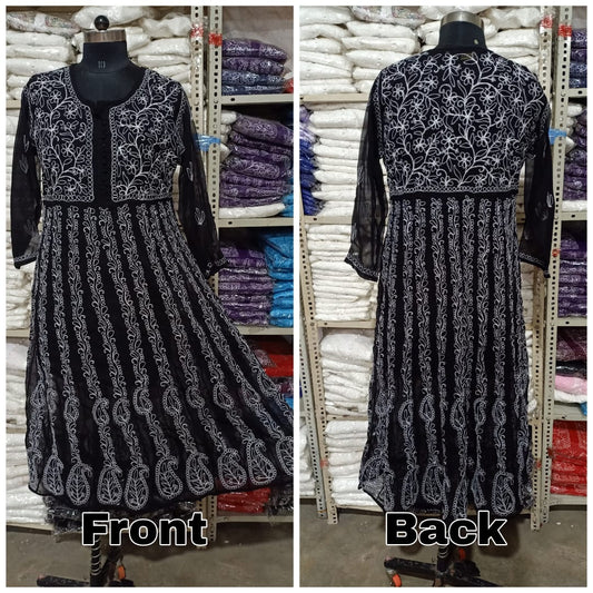 Lucknowi Chikankari Aari Embroidery Georgette Anarkali Kurti ( Black )with Matching Inner | ADR Chikan