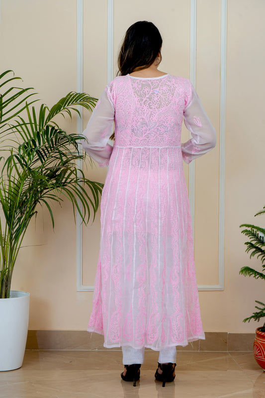 "ADR Chikankari Hand Embroidered Lucknowi Georgette 56 Kali Anarkali Kurti for Girls & Women"