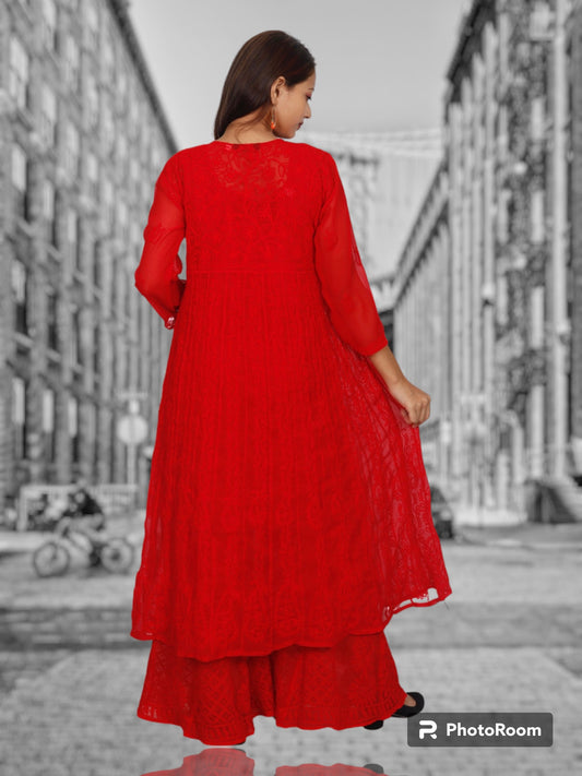 Lucknowi Chikankari Aari Embroidery Georgette Anarkali Kurti ( RED )with Matching Inner | ADR Chikan