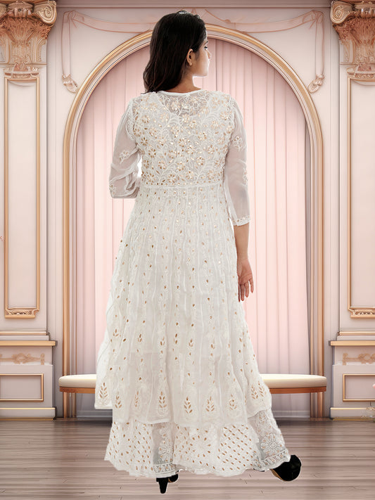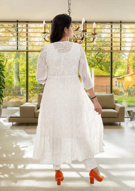 Lucknowi Chikankari Self-Tone Thread Aari Work Georgette 24-Kali Ankle-Length Anarkali with Matching Lining & Lycra Cotton Stretchable Pant Set | ADR Chikan