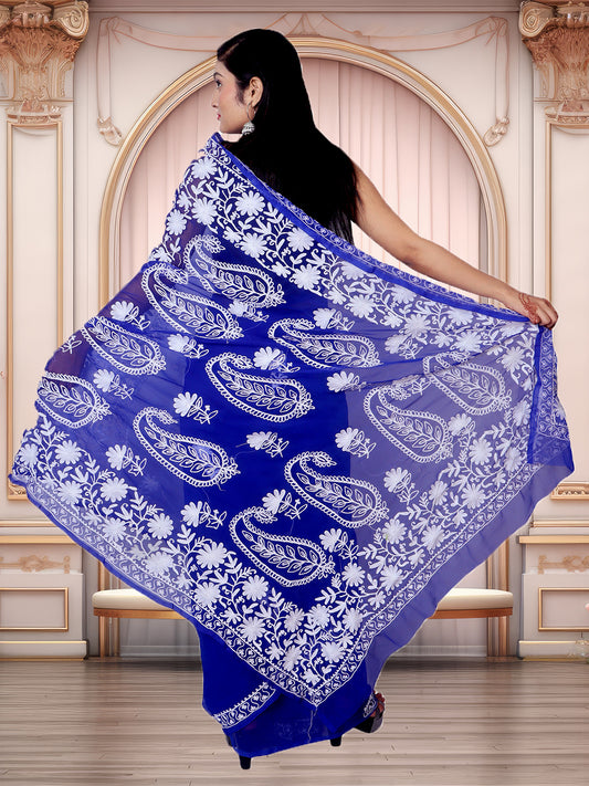 Fancy Butta Design Pallu Chikankari Embroidery Royal Blue Saree