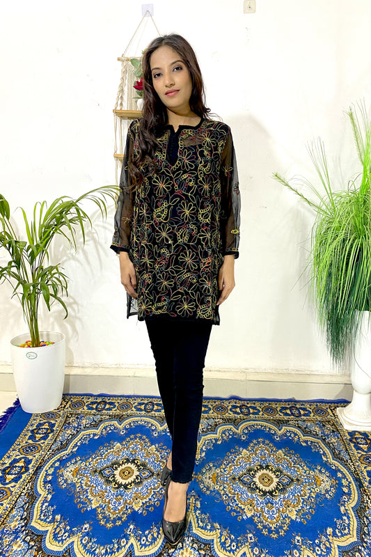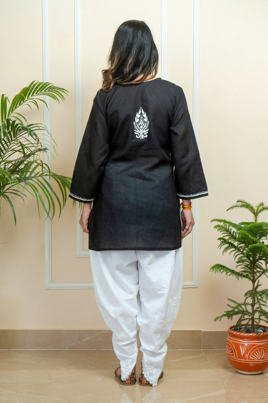 Lucknowi Chikankari & Kashmiri Aari Work Gala Booti (Black) Kurti – A Blend of Tradition & Elegance