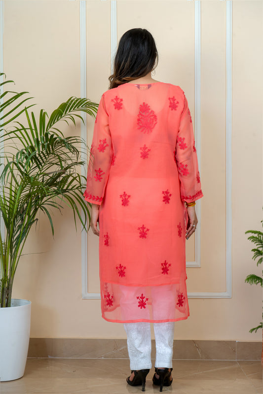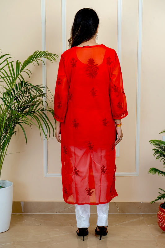 Lucknowi Chikankari Aari Embroidery Georgette Anarkali Kurti ( RED )with Matching Inner | ADR Chikan