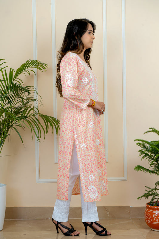 Lucknowi Chikankari Handcrafted Printed Fox Georgette Kurti | ADR Chikan