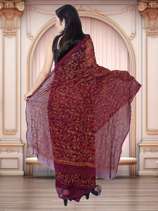 Tradition Lucknowi Chikankari Multi Thread Embroidery Georgette Wine Saree