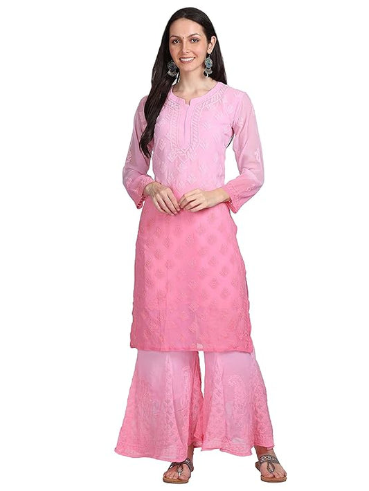 "ADR Women's Chikankari Handwork Straight Dyed Pink Kurti, Sharara & Dupatta Set with Inner"