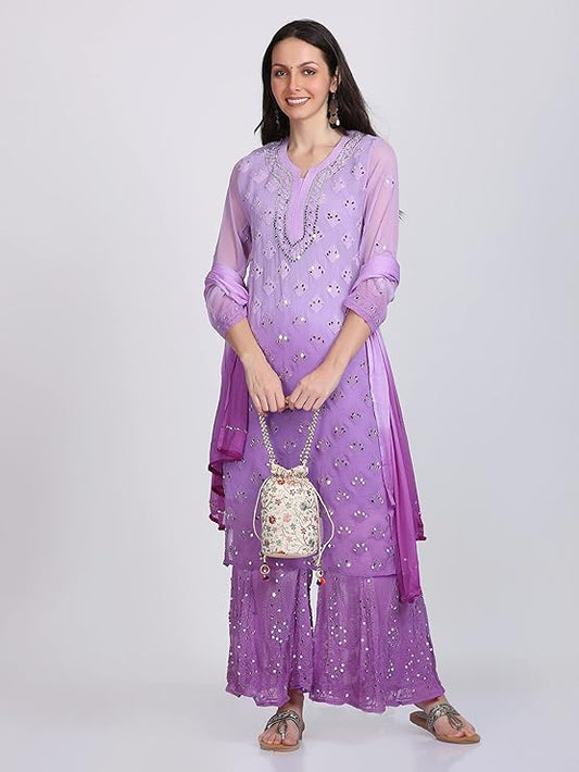 "ADR Women's Chikankari Handwork Straight Dyed Purple Kurti, Sharara & Dupatta Set with Inner"