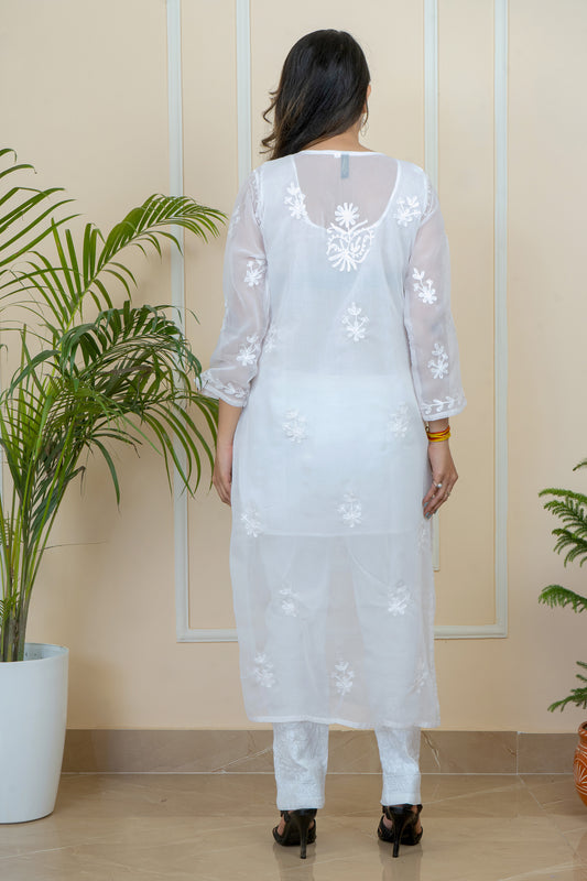 Kashmiri Work Georgette Chikankari Kurta with Lining & Lycra Cotton Stretchable Pant Set | ADR Chikan