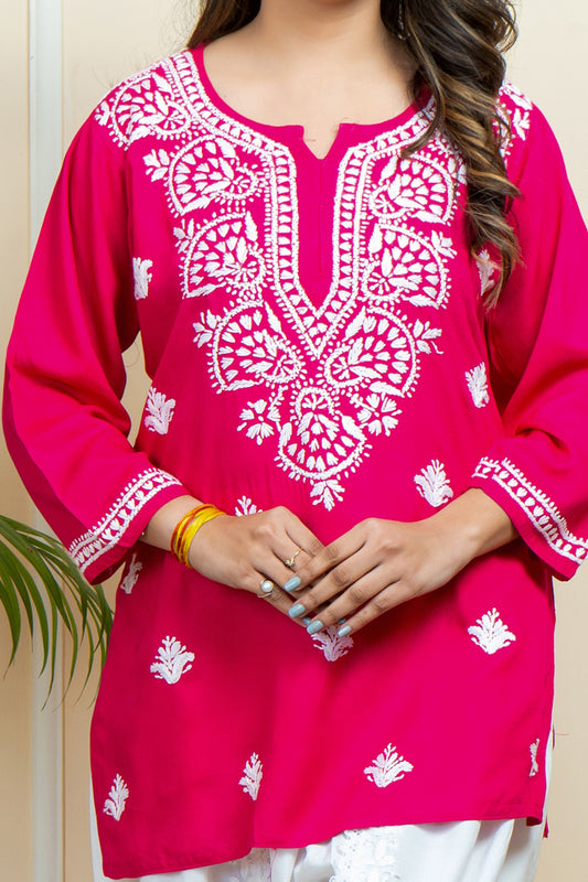 Lucknowi Chikankari Handwork Pink Rayon Short Kurti by ADR Chikan
