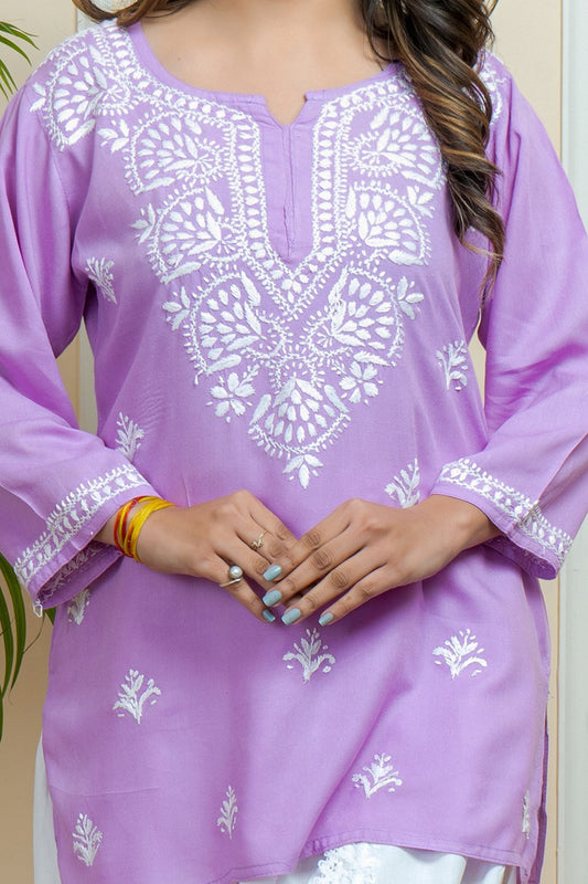 Lucknowi Chikankari Handwork Purple Rayon Short Kurti by ADR Chikan