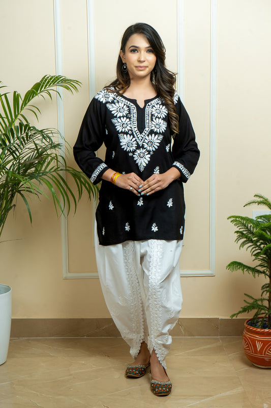 Lucknowi Chikankari Handwork Black Rayon Short Kurti by ADR Chikan