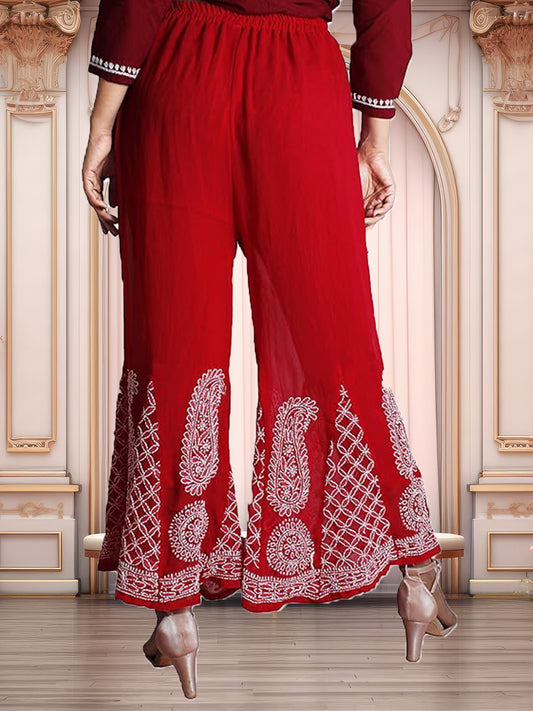 Lucknowi Chikankari Handwork Georgette Red Sharara by ADR Chikan