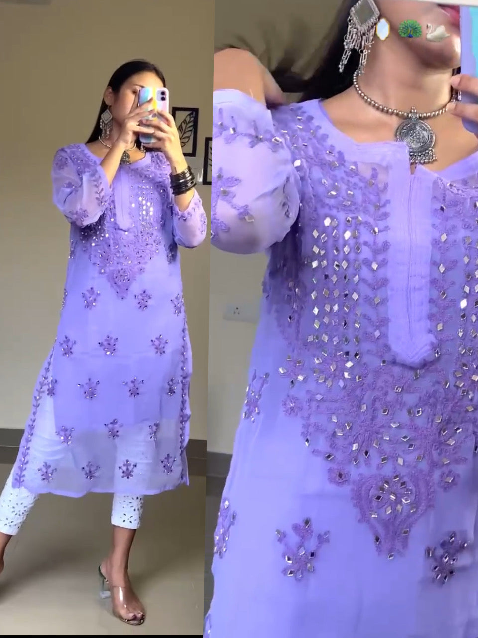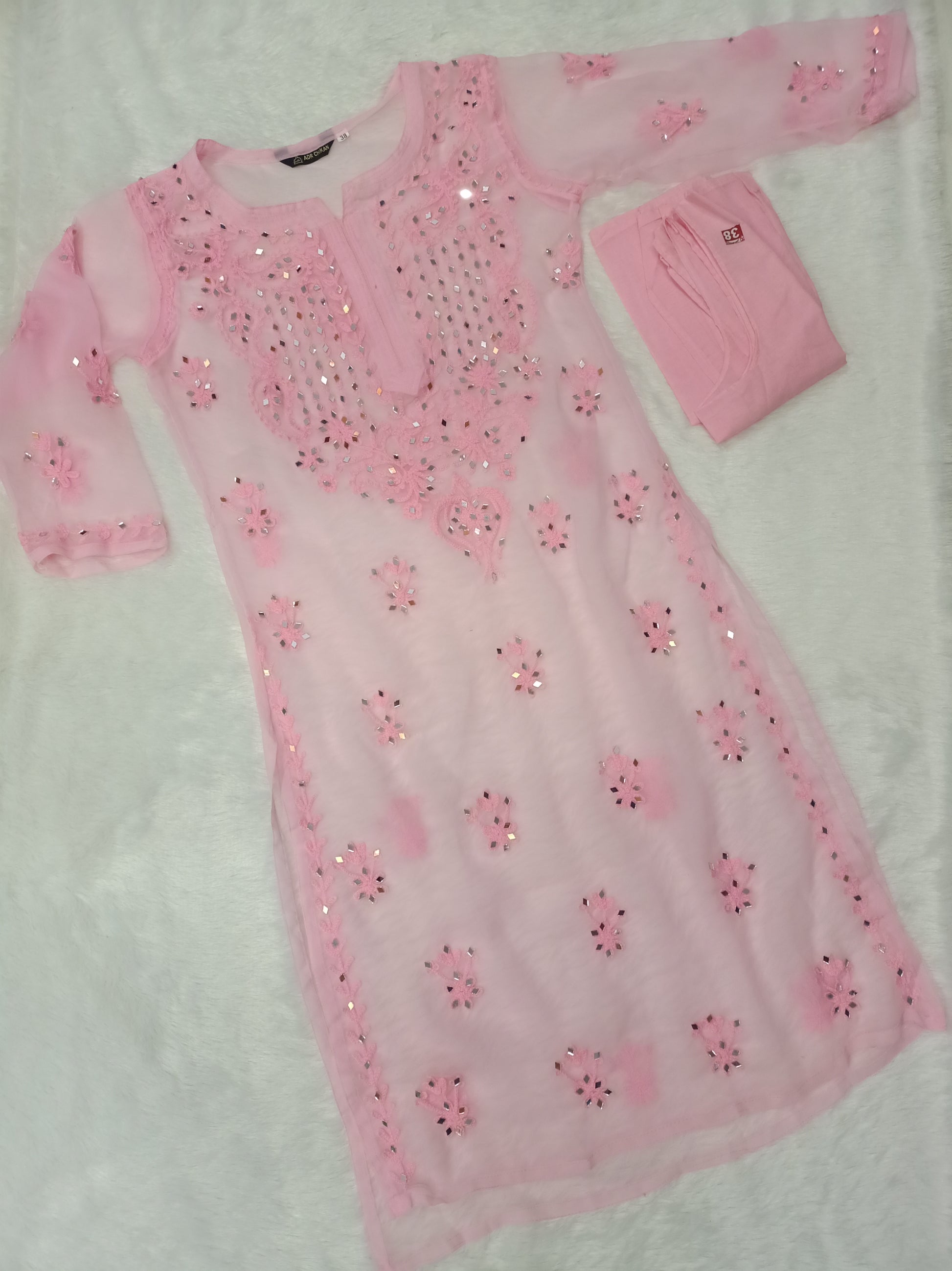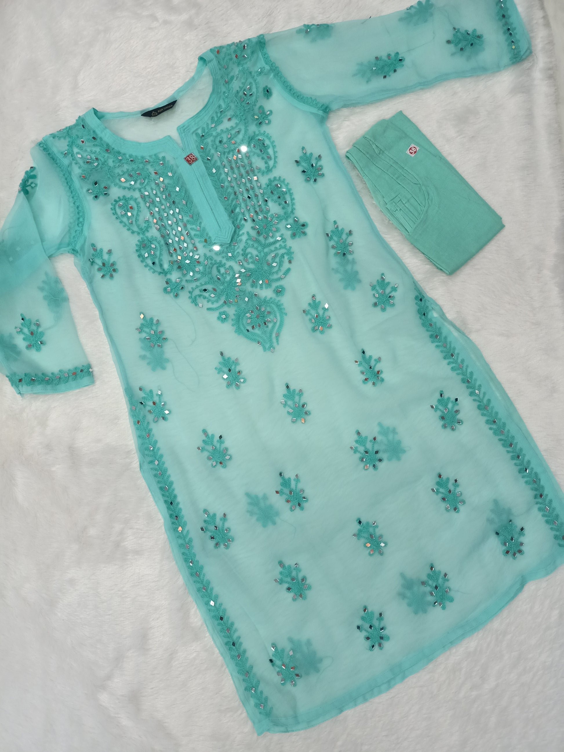 - **Authentic Mirror Work:** Features real mirror embellishments combined with intricate Aari Chikankari embroidery for a dazzling effect.